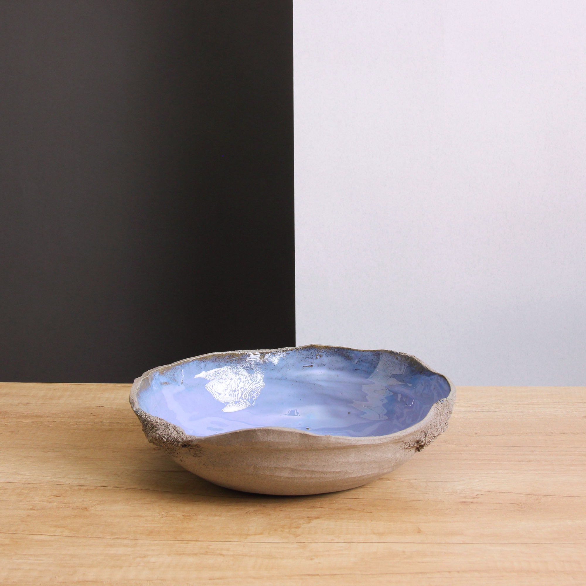 Handmade by grey stoneware clay, high fired at 1220 °C, this bowl reminisces the wild, yet the minimal feel of the peculiar flint and rock formations that go all the way into the sea. The light blue glazing interior is a subtle reminder of the water that surrounds it all.