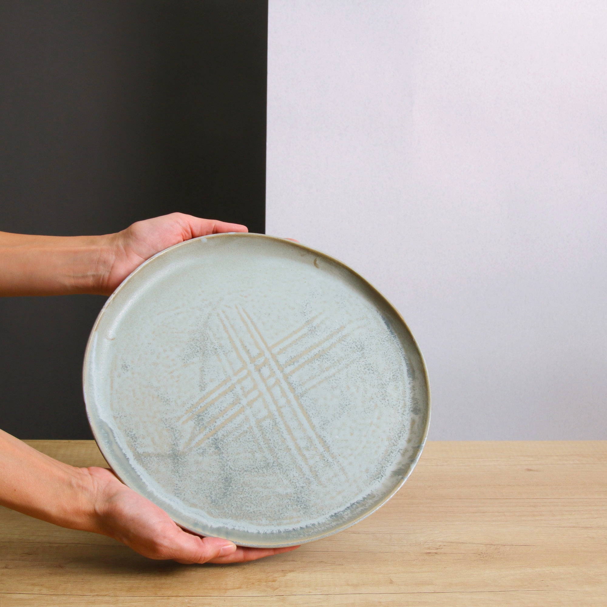 Inspired by the Mediterranean blue skies, this artisanal plate will put you in a mood of relaxation and comfort. It has a matte texture with a recognizable, discrete pattern of the artist that hand builds each piece. Made of stoneware clay, high fired at 1240 °C, it can also be used as a tray for the Hyle “raki” -the strong, Greek liqueur- set for your fun nights with family and friends.