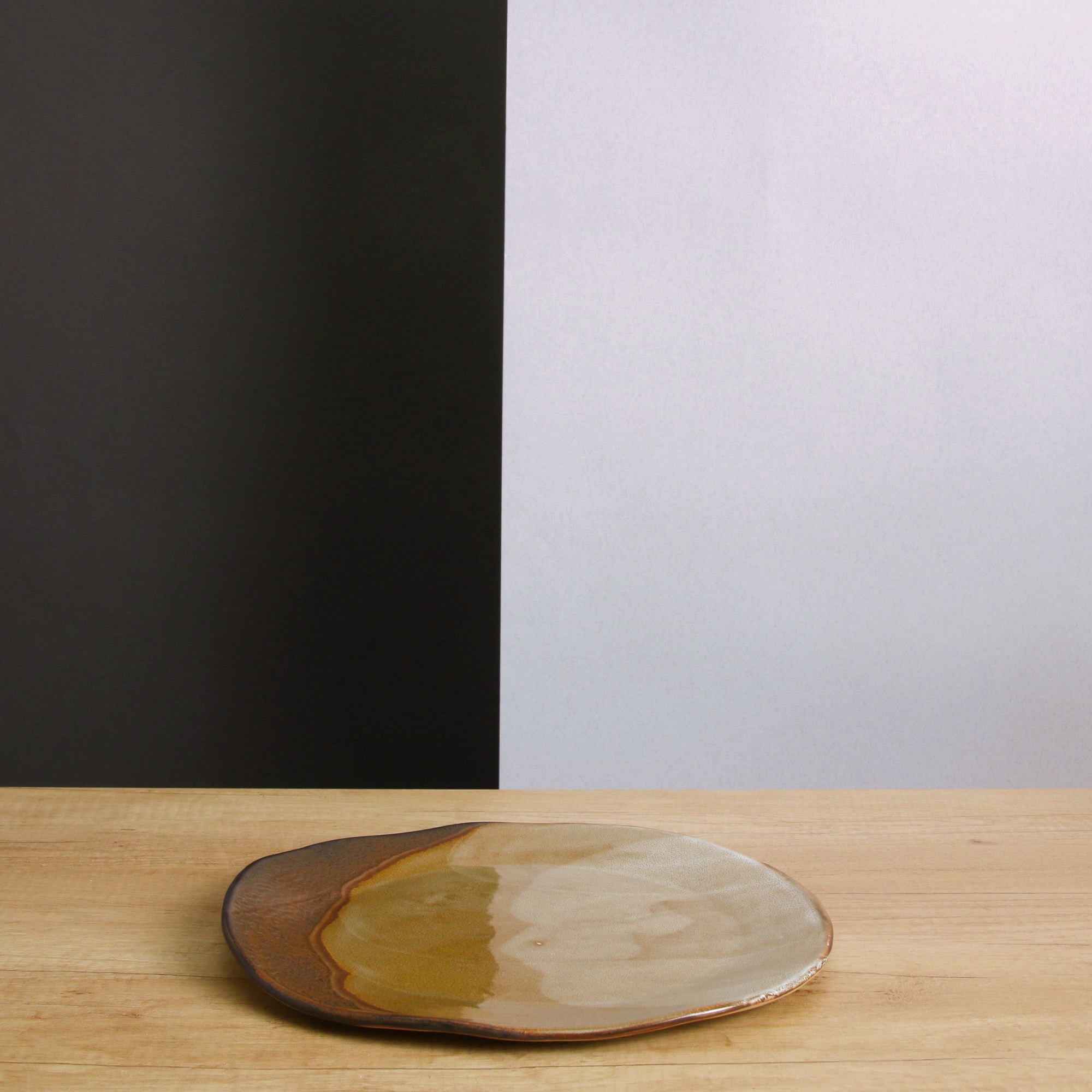 Artisanal plate with multiple, rusty brown glazing that honors the tradition of the copper-made, folklore “trokania” bells. Handmade of stoneware clay, high fired at 1240 °C, with both a glossy and matte glazing, thanks to a sophisticated technique that allows applying several layers of glazing. “Trokania” bells are the sheep and goat bells that villagers use to make joyous noises during the local carnival festivities.